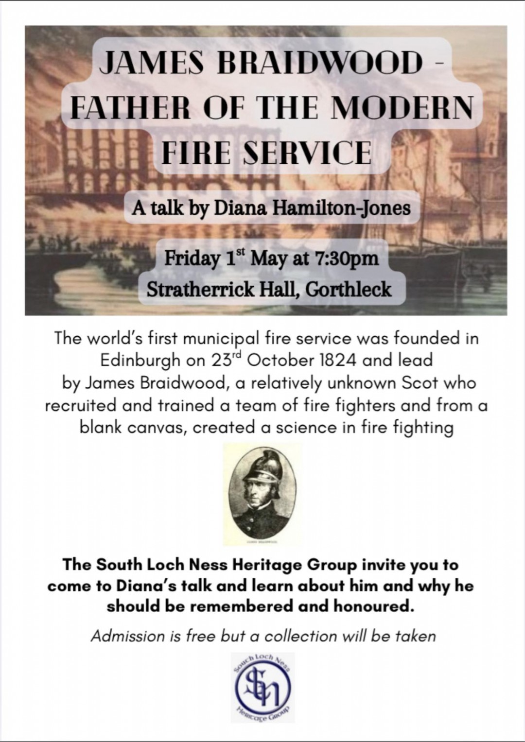 South Loch Ness Heritage Group hosting Diana Hamilton-Jones who will give a talk on James Braidwood. Admission is free but a collection will be taken.