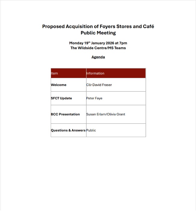 Please find the agenda for tonight’s public meeting at the Wildside Centre regarding the proposed community acquisition of Foyers Stores. 1. Welcome &n... -