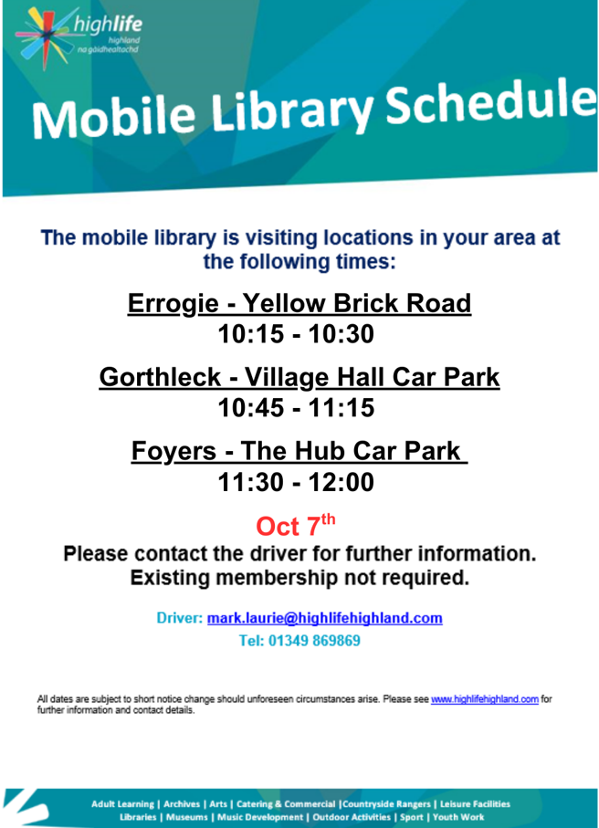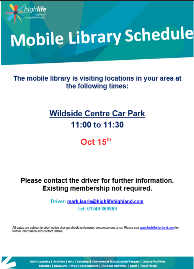 We are lucky to have a Mobile Library service available in our community! If you fancy a new read and would like to give the mobile library a go then please pop along at the dates and times below and meet Mark, our lovely local librarian.
